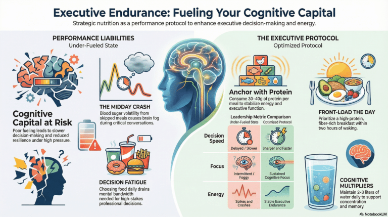 In the C-suite, brain fog and midday crashes aren’t just “wellness issues”—they are performance liabilities. When your decision-making is fueled by caffeine and inconsistent meals, your organizational leverage suffers. This isn’t about “dieting”; it’s about performance protocols. Discover how to stabilize your blood sugar, eliminate decision fatigue, and treat your nutrition as the ultimate strategic tool to sustain your edge through Q2 and beyond.