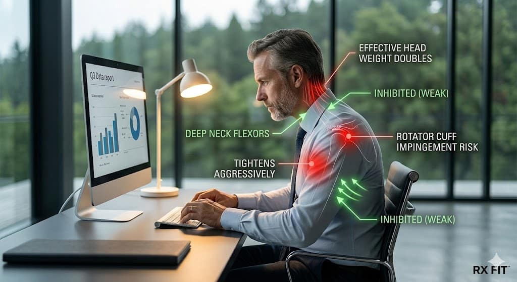 Prolonged sitting at a workstation in Silicon Hills or Westlake locks your body into a pathological state known as Upper Crossed Syndrome. The physics of leverage dictates that your head weighs about 10 to 12 pounds. But as your head drifts forward into your monitor to read that Q3 report, the effective weight on your cervical spine doubles.