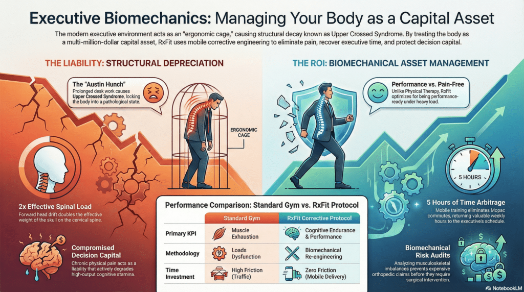 As a founder, you wouldn’t let a multi-million-dollar server farm overheat, yet you ignore the structural degradation of your own spine. At RxFit, we treat the executive body as Austin’s most valuable capital asset. We deploy mobile Corrective Exercise Specialists to re-engineer joint mechanics, ensuring your biological infrastructure matches your financial ambition.