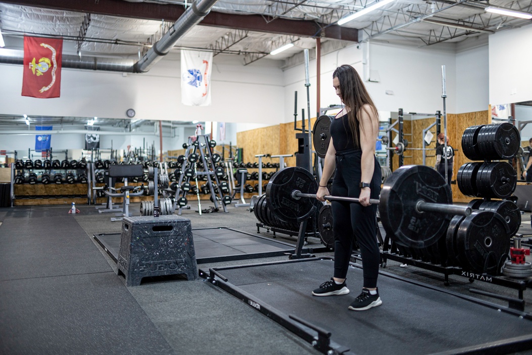 Grace Recla holding a kettlebell in a fitness environment, showcasing strength and determination, with exercise equipment in the background, emphasizing her fitness philosophy and commitment to health.