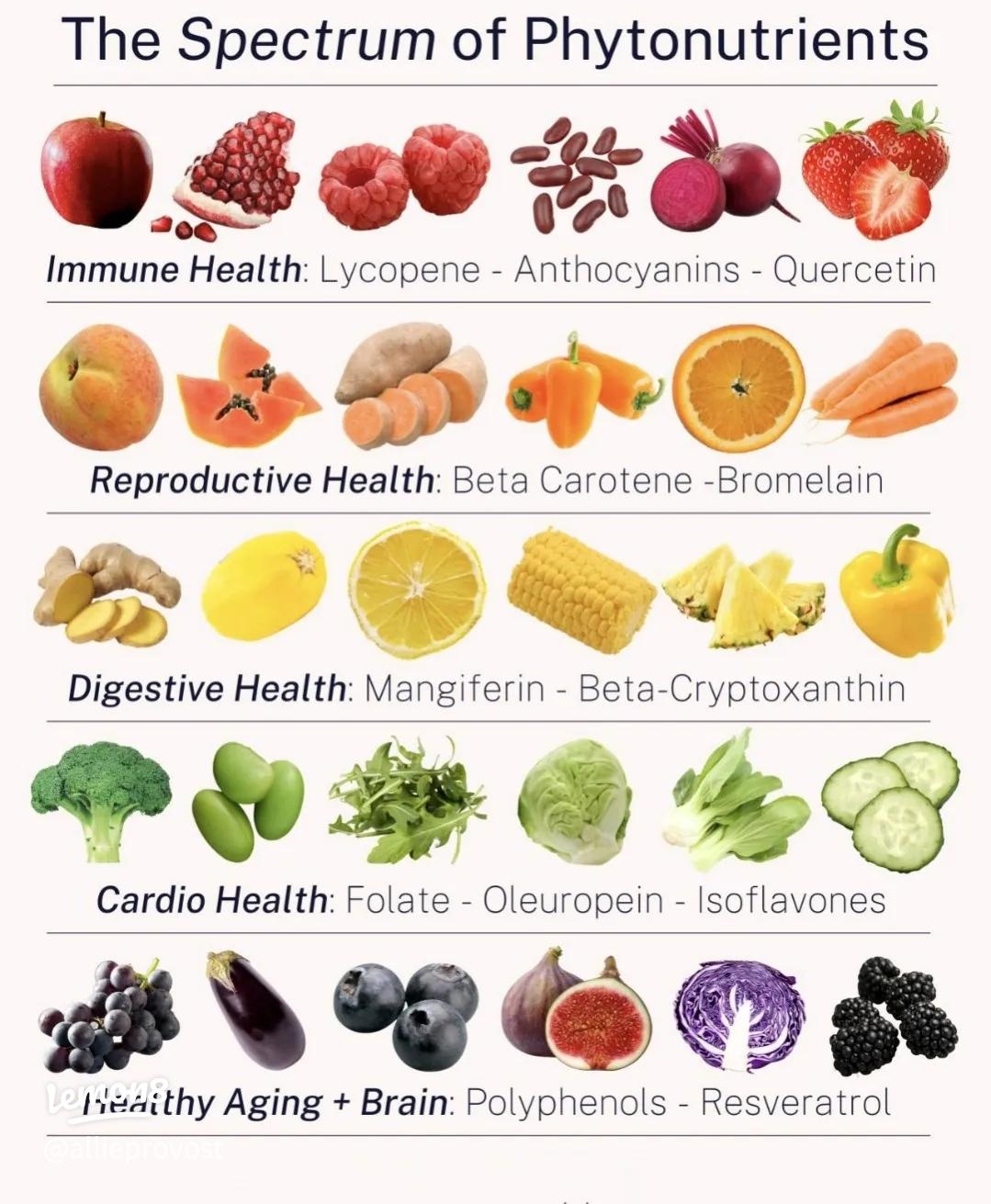 Spectrum of phytochemicals showcasing various fruits and vegetables categorized by health benefits, including immune, reproductive, digestive, cardio health, and healthy aging.