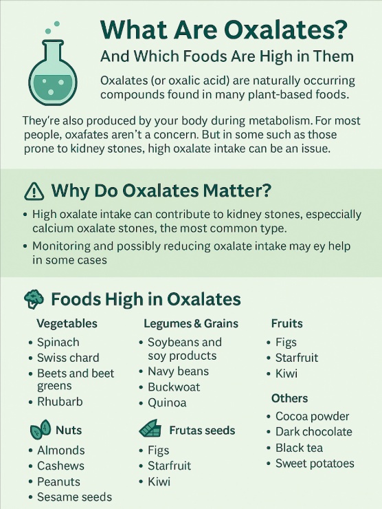 Foods high in oxalates include spinach, rhubarb, beets, nuts, and chocolate. These foods can contribute to oxalate accumulation in the body, so it's important to consume them in moderation if you're managing oxalate intake.